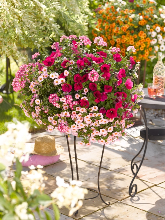 Neben den bekannten Mischungen aus verschiedenfarbigen Minipetunien der Calibrachoa-Gruppe kommen dieses Jahr weitere farbenfrohe Kombinationen auf den Markt. Die verschiedenen Mischungen aus Verbenen, Petunia und Millionbells werden für Furore sorgen, ob elegant in pastellfarbenen Tönen oder leuchtend mit kräftigen Blütenfarben. Die Mischung aus drei verschiedenen Hängelobelien eignet sich auch für einen schattigen Standort auf der Nordseite des Hauses.