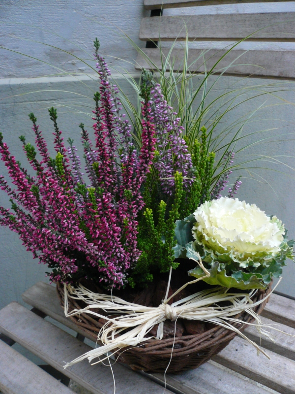 Offene Lücken zwischen den Pflanzen eignen sich ideal zum Ausgarnieren mit Steinen, Zierkürbissen, Baumnüssen, Maiskolben oder vielen weiteren Naturprodukten. Einen weiteren Farbtupfer verleiht das farbige Juteband, mit welchem das Gefäss eingewickelt werden kann. Gerne helfen wir Ihnen bei der Bepflanzung und dem Ausgarnieren Ihrer Herbstkistli.